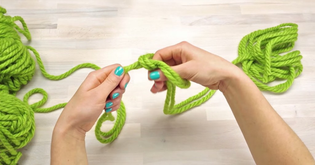 Нам понадобится 3 мотка пряжи. Чтобы сделать первую петлю, отмотайте от мотка 1,5 метра нити и сделайте петлю, надев ее на руку, как на фото.