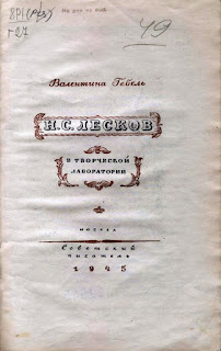 Вторая книга о Н. С. Лескове, которую я хочу вам представить, также издана в 1945 году, подписана к печати 11 августа 1945 года. Эта книга — одна из первых попыток изучения творческой лаборатории Н. С. Лескова, предпринятая автором монографии Валентиной Гебель.