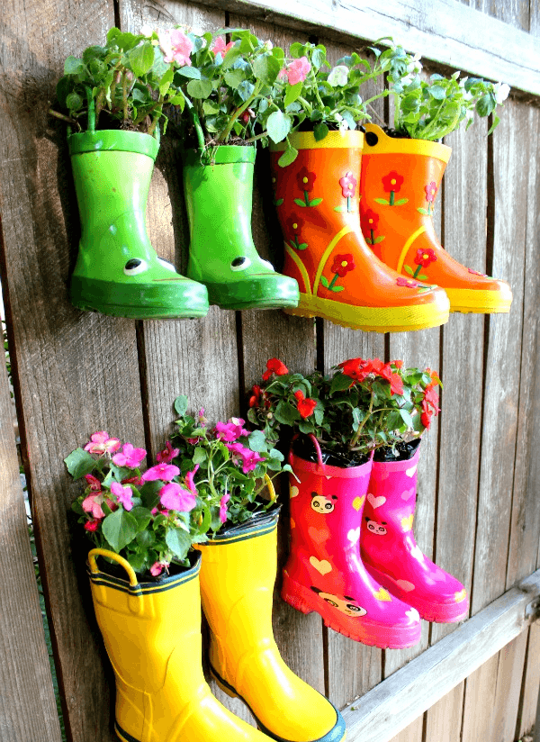 - Весьма оригинально смотрятся вазоны из старых резиновых сапог. Их можно покрасить, раскрасить, прикрепить к забору, просто выстроить в ряд. Тут уже волю дайте своей фантазии и воображению, и оно точно вам подскажет, как расположить сапоги, чтобы они смотрелись изысканно: