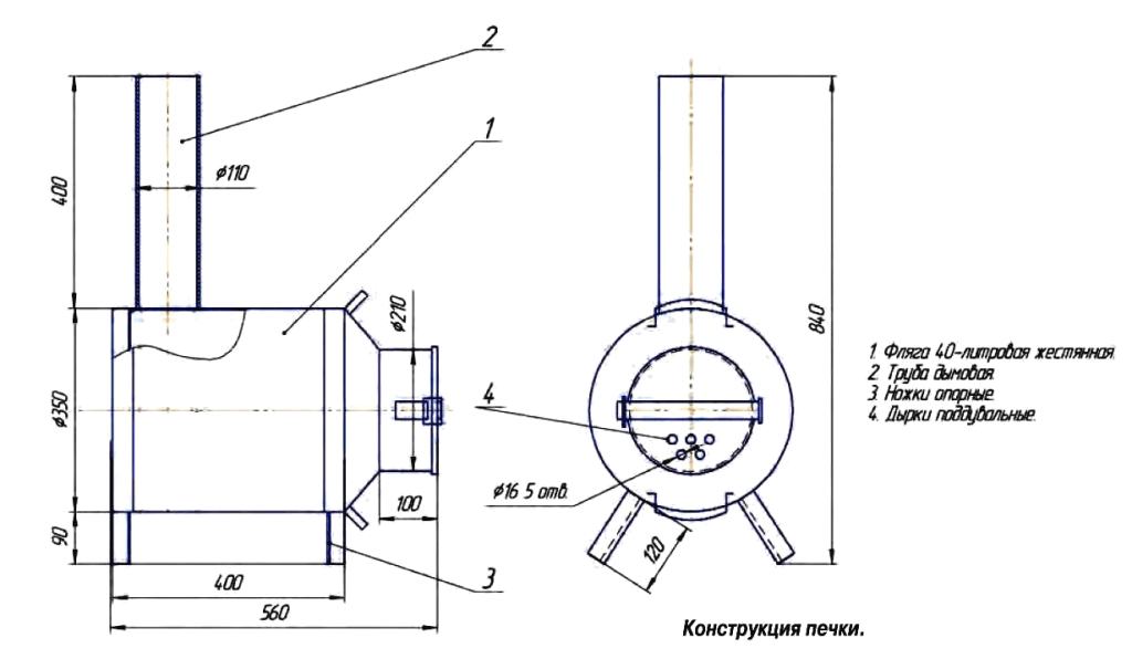имеет устойчивые навыки и слесарных работ. Достаточно проявить фантазию или воспользоваться чертежами готовых разработок – и все должно получиться. Главное, и при изготовлении, и при эксплуатации подобных печек – постоянное соблюдение элементарных мер безопасности, чтобы отопительный прибор не стал причиной большой беды.
