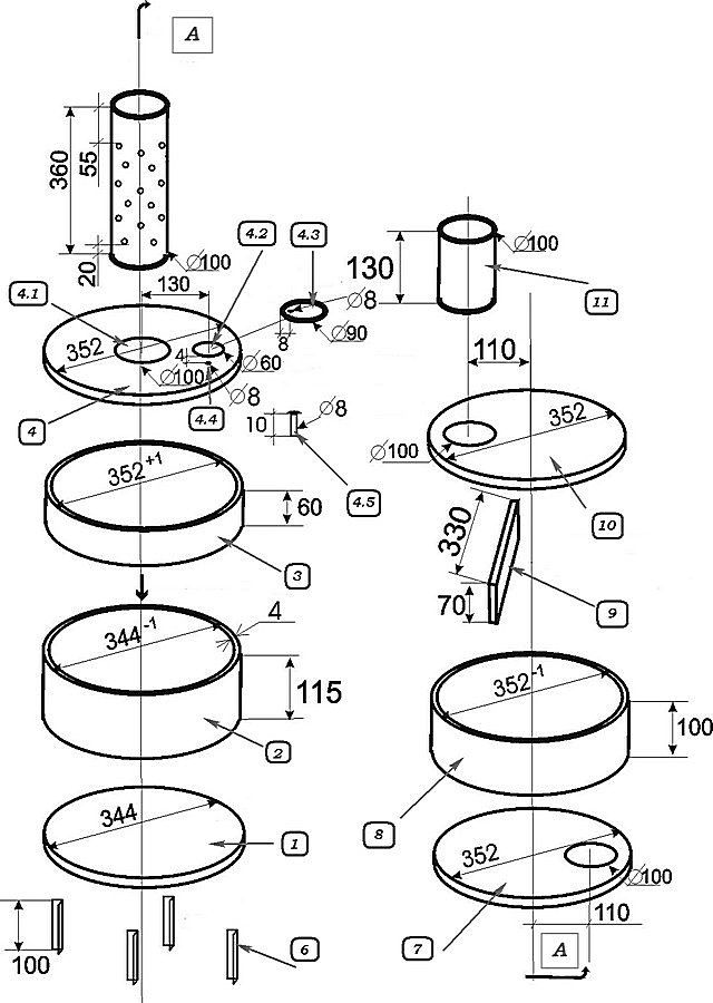 Примечание. При изготовлении печи из трубы Ø300-500 мм потребуется установка днища зольника (сталь 2 мм), а воздушная камера получится цилиндрической.