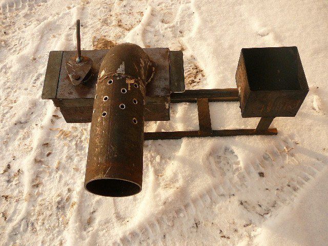 используется обычная дровяная буржуйка, куда эта изогнутая труба подключается с помощью адаптационного приспособления. Например, в обычной буржуйке можно дверцу топки сделать съемной