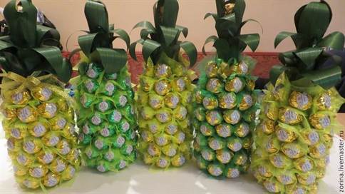 Для создания экзотического фрукта понадобятся конфеты круглой формы с золотым, оранжевым или желтым фантиком. Обычно используют «золотую лилию» или трюфели в золотистой фольге.