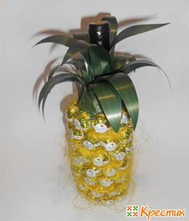 Лучше всего использовать для композиции «Ананас» бутылку шампанского «пузатой» формы. С ней ваш фрукт получится максимально правдоподобным.