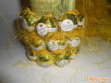 - Слегка раздвиньте мишуру внизу бутылки и приклейте за хвостик первую конфету. Сделайте ряд из 4 конфет, равномерно распределив их по кругу.