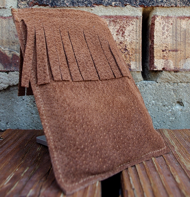 7. Пришейте каждую половинку с бахромой к передней и задней частям чехла как показано на картинке.