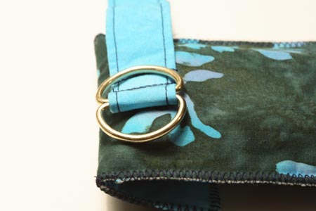 4. Наденьте D-кольца на ремешок и согните его в противоположную сторону. Застрочите ремешок двумя рядами ниток в месте, указанном на картинке.