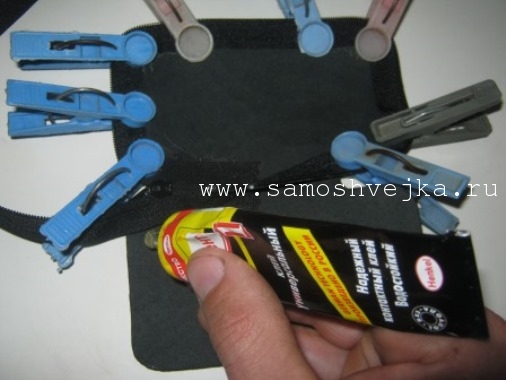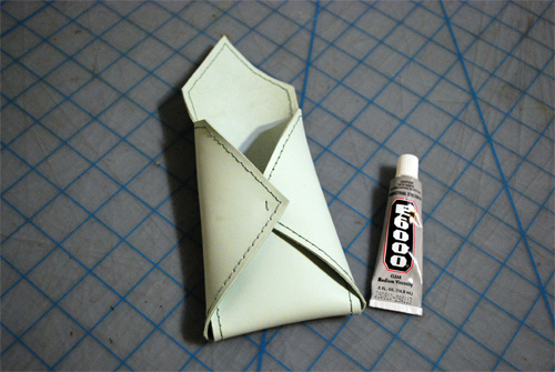 Шаг 12. Склейте две половинки кожаного чехла между собой. Для удобства нанесения клея тонкой полоской, можете использовать прочный полиэтиленовый пакетик. Для этого его угол нужно будет аккуратно срезать, как это часто делают в кулинарии для нанесения крема.