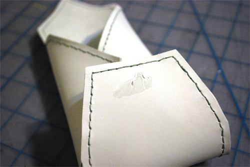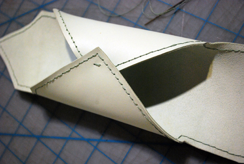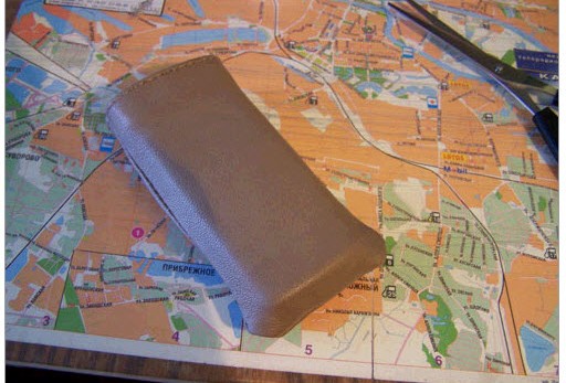 - Из оставшегося кожаного полотна вырезать маленький прямоугольник или овал и пришить его к нижней части чехла.