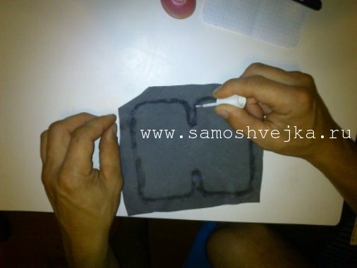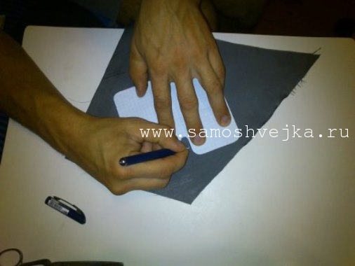 Теперь нам нужно вырезать отверстия с верху для удобного изымания нашего аппарата из чехла. Я использую макет из картона. Обрисовываю его ручкой а затем уже вырезаю обычным канцелярским ножом: