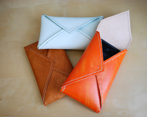 - Вырезать кожаную заготовку (вы уже знаете, каким способом: по размеру мобильного телефона, но не забудьте про форму конверта).