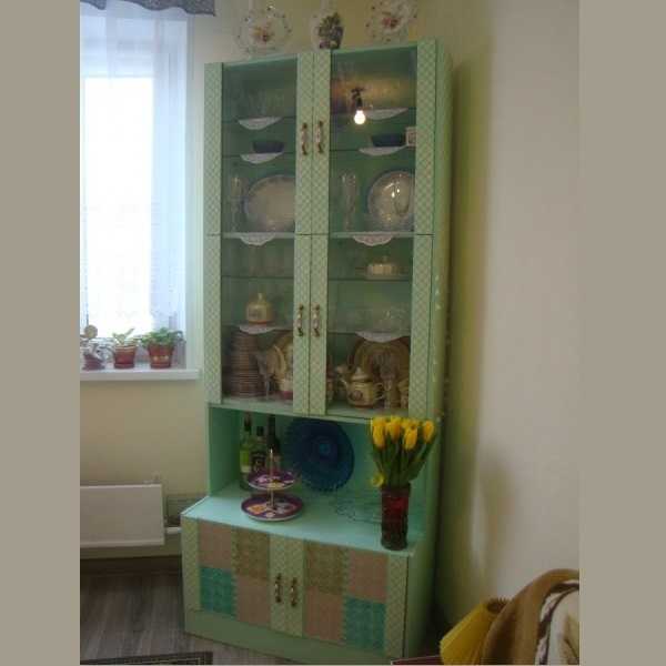 Наверное, у многих еще остались такие бабушкины серванты. Когда не было другой мебели, мы были рады и такой. А теперь времена меняются и такая мебель не совсем вписывается в современный дизайн. Но ведь это не беда, правда? Кстати, таким же способом можно переделать любой шкаф, кухонный гарнитур, комод, стол и многое другое.