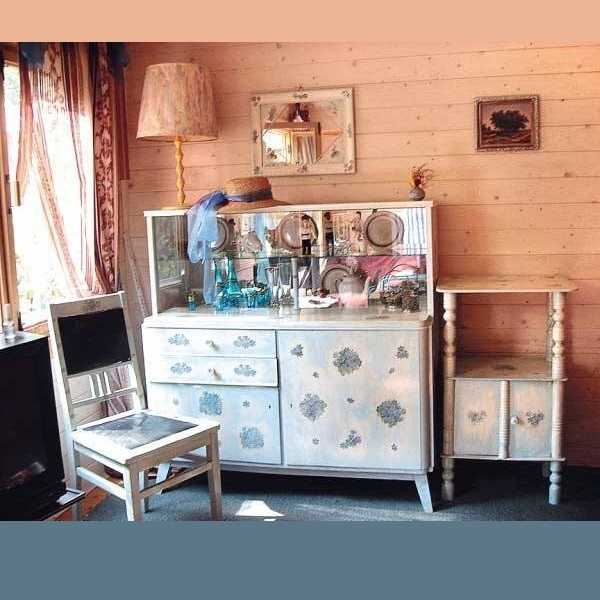 - декупаж, заключающийся в наклейке на элементы мебельных конструкций аппликаций – аккуратно вырезанных из ткани ли бумаги рисунков, флористических узоров, натюрмортов, коллажей;