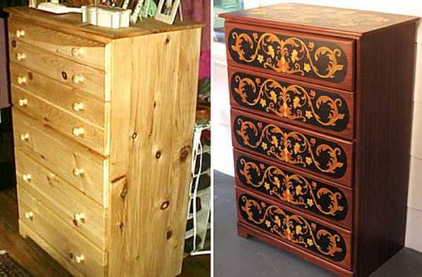Для того чтобы отреставрировать старую мебель методом росписи, нужно иметь минимальные художественные таланты. Если мастер в себе их не находит, то лучше не браться самому за эту процедуру, а пригласить приятеля или приятельницу — вдвоем дело пойдет веселее. Суть метода достаточно проста – это нанесение на подготовленную плоскость, рисунка, орнамента или узора.