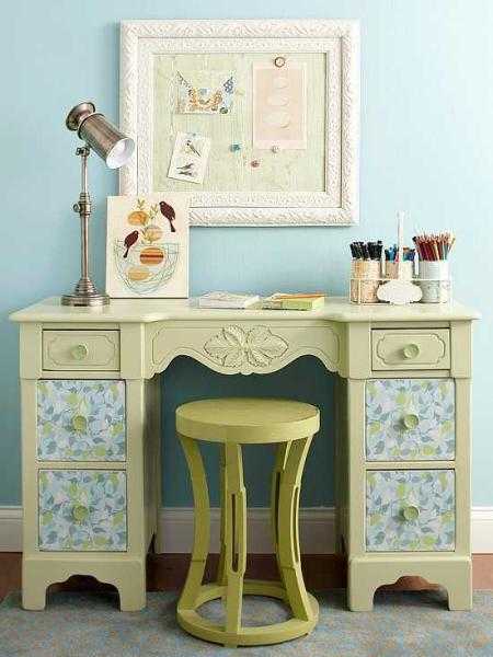 Когда обновленную поверхность планируют украшать в стиле декупаж, дополнительно приобретают рисунок или салфетки, из которых его вырезают, и клей. Для росписи используют более тонкие кисти и широкую палитру колеров. Декорируют старую мебель и с использованием трафаретов.
