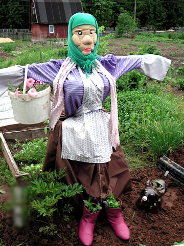 Весной у всех дачников начинаются самые приятные заботы и хлопоты на своем участке: уборка, подготовка земли, и, конечно же, сажание семян. Вот здесь и подстерегает опасность – голодные и хитрые птицы, которые только-только вернулись из теплых краев, с удовольствием съедят все зерна. Вот почему издавна предприимчивые огородники сооружали для отпугивания прожорливых птиц чучело огородное своими руками, и из всего того, что оказалось под рукой: ведра, метлы, швабры и сена. А кто-то проявлял фантазию и красиво украшал своего огородного сторожа – надевая на него старую рубаху и даже шляпу с цветочками.
