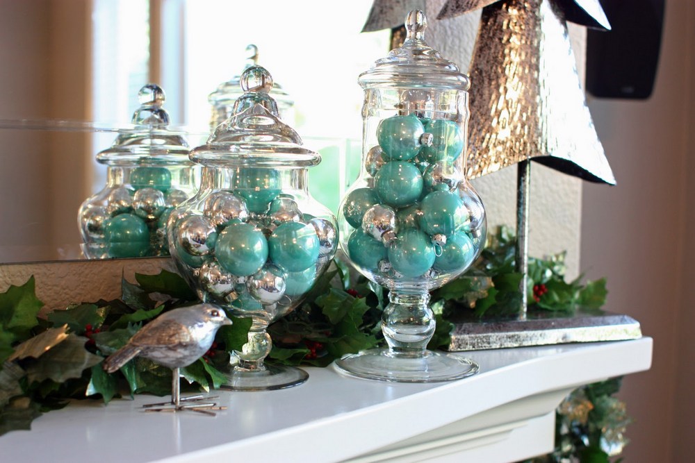 На камин можно аккуратно выложить еловые веточки, причем неважно будут это искусственные ветви или настоящие, просто натуральные будут источать умопомрачительный хвойный запах, говорящий о наступлении торжества! На камин можно повесить носочки (по американским традициям) для сладостей и небольших подарков. Кроме того на каминную полку можно поставить крупные прозрачные вазы, наполненные цветными разнокалиберными елочными шарами, рядом установить крупные свечи, и статуэтку — символ наступающего года, а на его торцевой части повесить «игривую» электрическую гирлянду.