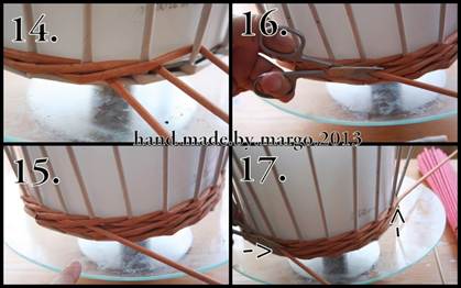 - Выплести каёмку, заведя крайнюю левую лозу за каждую 4-ю стойку. В конце просунуть крайний правый элемент за 4-ю стойку, вывести наружу и срезать.