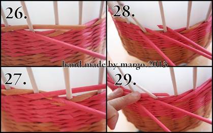 - По достижению нужной высоты полосы загнуть внутрь и вплести под крайнюю горизонтальную полоску. Работа над поделкой корзинка своими руками завершена.