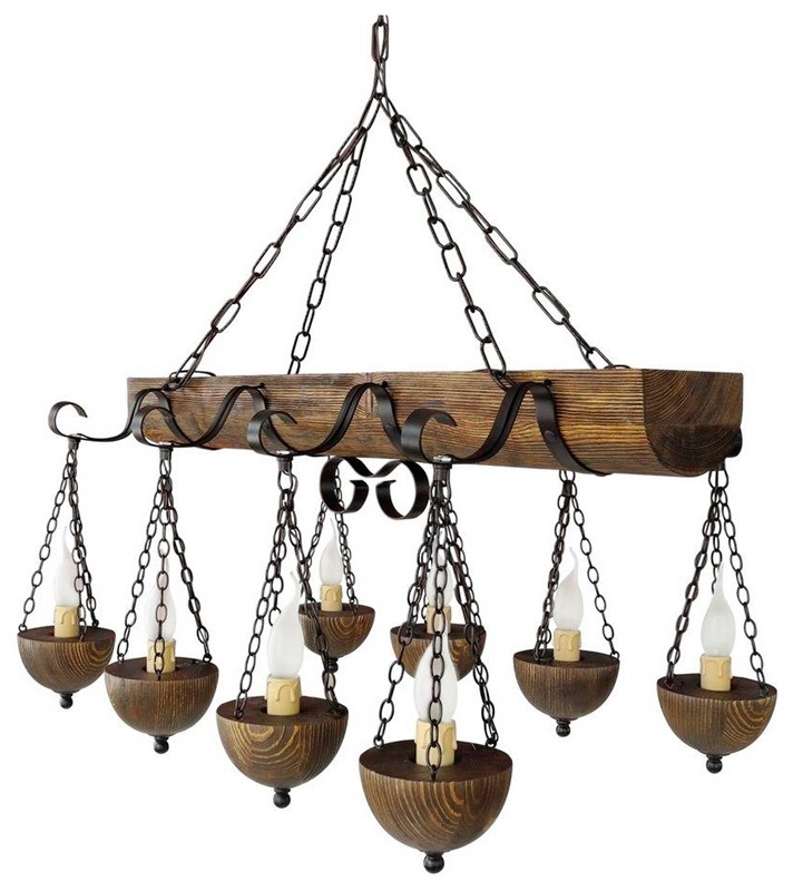 Люстра, где гармоничным образом сочетается дерево, металл и стекло, незримо погружает в атмосферу Средневековья, где по темным коридорам можно встретить рыцаря в латах. Такой светильник идеально впишется в интерьер просторной гостиной загородного дома или кафе, где интересно обыграна тема старины.