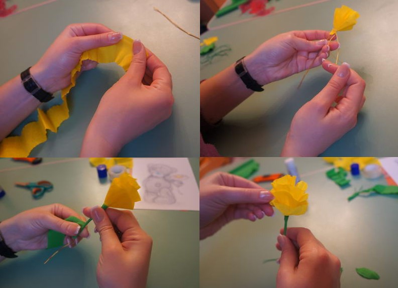 3. Сделайте таким образом нужное количество цветов. Также из зеленой плотной бумаги вырежьте лепестки.
