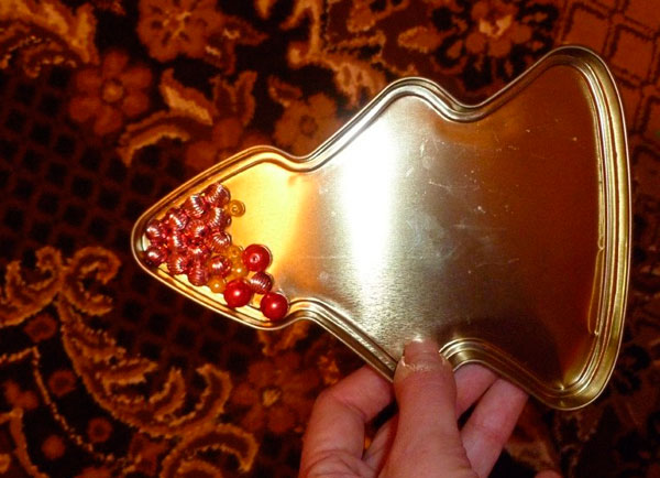 Затем ёлочные бусы, отдельные бусинки, пайетки, бантики – и всё на клей «Момент»