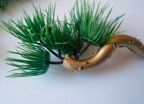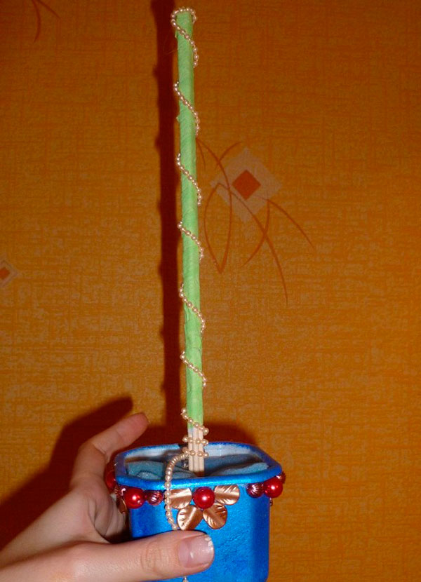 К слову, для удобства декорирование кроны елочки лучше осуществлять перед закреплением ее на основании. В отличии от деревца, елку необязательно устанавливать в горшочке: основание модно сделать с помощью крестообразной конструкции из карандашей или в виде цилиндра с размерами, достаточными для устойчивости дерева.