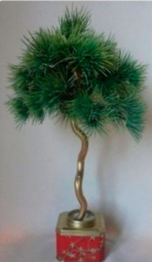 Новогодний топиарий с изогнутым стволом посажен в деревянный горшок и укреплен гипсовой заливкой.