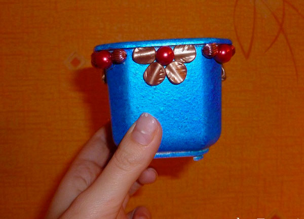 Этап 7. Декор кашпо. Клеим пластиковые снежинки, красные стразы, миниатюрные белые полубусины — на каждой стороне горшка, равномерно.