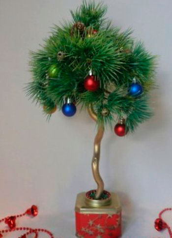Отличный вариант подарка к этому празднику – новогодняя елочка топиарий своими руками. Процедура создания самого деревца практически не отличается от стандартной: та же ось и основа в виде прочной емкости. Но верхушка деревца делается по-другому: конусообразную форму можно сделать не только из пенопласта, но и с помощью папье-маше, ткани или прочного картона, заполненного внутри.