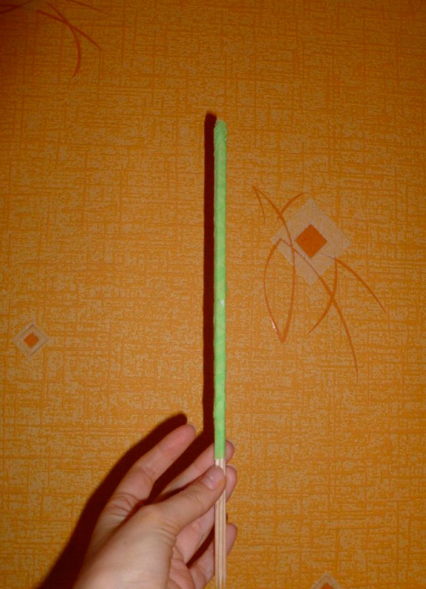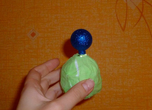 Этап 1. Обмотка шара. Подготовленный ствол (гладкий) необходимой длины слегка заостряем с одного конца, промазываем клеем или горячим силиконом, фиксируем в заранее проделанном отверстии в пенопластовом шаре. Полностью обматываем основу любой тканью.