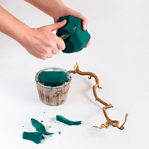 Этап 8. Заливка гипсом. В горшок укладываем кусочки пенопласта или губки, чтобы гипс при расширении не раздвинул стенки деревянного ящичка. Замешиваем густой раствор гипса или алебастра с водой (пропорция 2:1), заливаем горшок на ¾ объема.