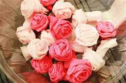 2. Свободно скручиваем полоску и скрепляем ниткой. Потребуется около 20-30 таких розочек.