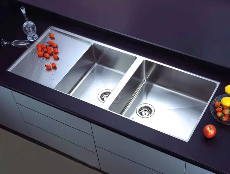 Встроенная модель устанавливается в столешницу при помощи прижимов и кронштейнов, специально предусмотренных для ее крепежа. Они располагаются на внутренней ее стороне, в них закручиваются подходящие шурупы. Эта конструкция дороже накладной, но в отличие от нее позволяет избежать сырости, так как ее можно крепить на любую столешницу, а не только выполненную совместно с тумбой. И бортик ее крепления менее заметен, он идет высотой всего 2-5 мм, тогда как у его аналога достегает 3 см.