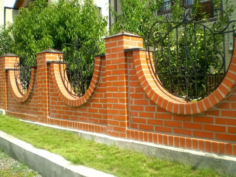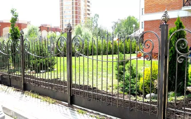 Отлично смотрятся бетонный столбы с пролетами из доски. Подойдут и металлические опоры с ковкой, которая постепенно переходит на пролеты.
