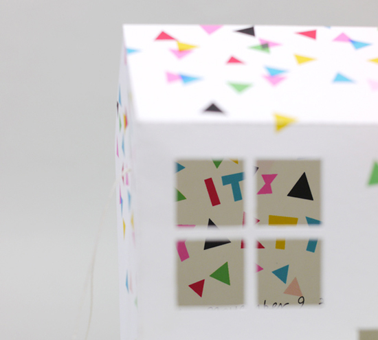 Теперь нужно взять плотную белую нить, сложить вдвое, продеть ее в заранее проколотое отверстие в месте сгиба, у основания крыши, на боковой стене домика. Завязав концы нитки в узелок с внутренней стены домика а с внешней приклеить цветной треугольник. Тоже самое, и на точно таком же расстоянии нужно проделать на второй стенки домика.