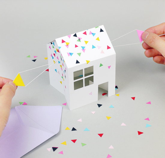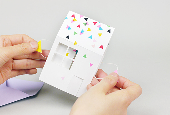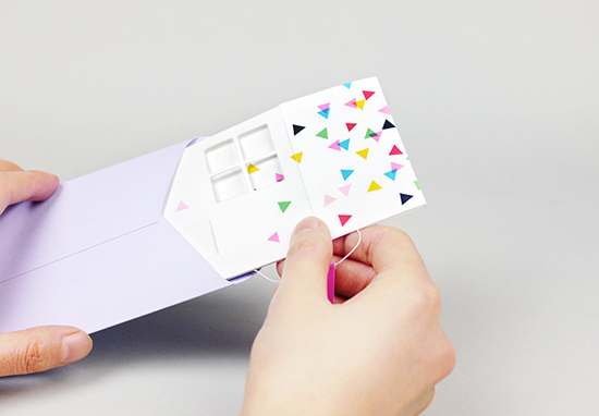 А когда он вынет и раскроет секрет открытки, потянув за края ниточек — перед ним развернется бумажный домик.