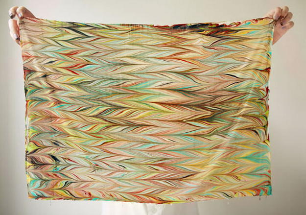 Хочу сразу добавить, что отпечатки эбру можно с успехом делать на ткани, дереве. Таким образом получаются великолепные шелковые платки.Чтобы разом окрасить весь платок, нужна соответственно емкость с большой площадью.