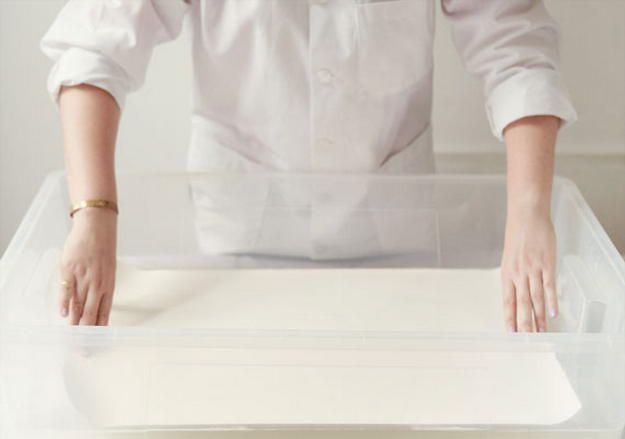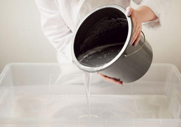 2. Налейте, получившуюся основу в лоток. Заполнять лоток полностью не следует, достаточно, чтобы жидкость покрывала дно. Если на поверхности образовались воздушные пузырьки, удалите их, накрыв раствор на 2-3 минуты бумагой.