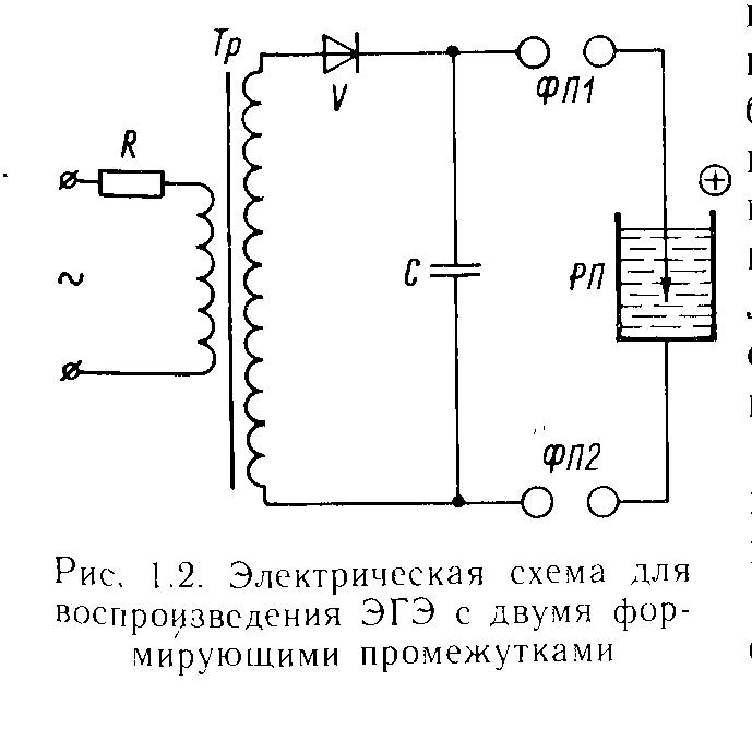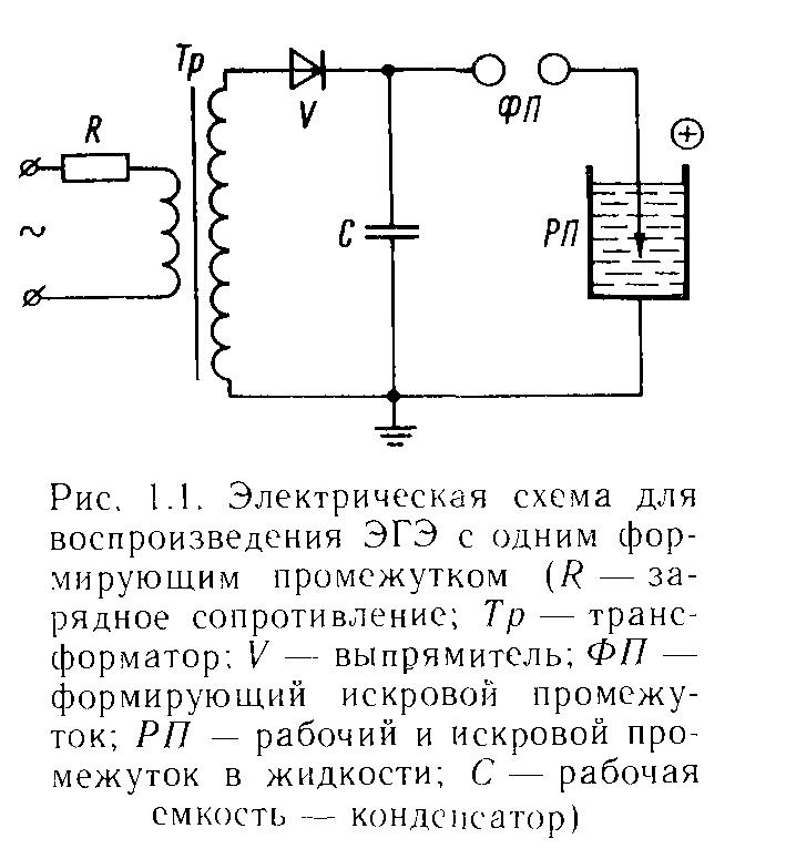 сопротивление, Тр – трансформатор, V – выпрямитель, ФП – формирующий искровой промежуток, РА – рабочий и искровой промежуток в жидкости, С – конденсатор, ФП1 и ФП2 – формирующий искровые промежутки 1 и 2.