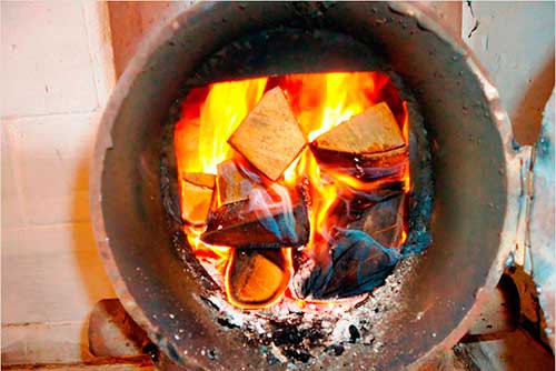Топливом может являться уголь или дрова, для уменьшения расхода существуют печи с установленным над дверцей выходным патрубком, куда помещается топливо. Конструкция позволяет получить максимальное количество тепла, и только после этого продукты сгорания попадают в выводную трубу. Также для повышения теплоотдачи стенки печи покрывают слоем глинобетона или кирпичной кладкой. Глинобетон – кирпичная крошка, смешанная с раствором глины. За счет расстояния межу каркасом печи и кирпича образуются потоки воздуха, за счет которого увеличивается теплоемкость и как следствие повышается скорость обогрева.