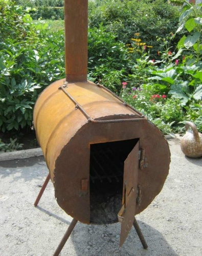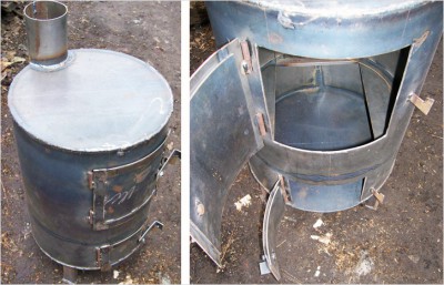 Сделать буржуйку из бочки или обрезка трубы еще проще. В случае бочки нужно только устроить дверцу, дымоход и ножки. Если у вас есть обрезок трубы, диаметром не менее 300 мм, то можно сделать из листового металла заднюю часть печки и дверцу. Все остальное сооружают аналогично предыдущим вариантам. Некоторые умельцы делают хорошие буржуйки из старых газовых баллонов. Для их разрезания, нужно сначала просверлить аккуратно отверстие, поливая сверло водой. Затем слить из баллона конденсат и залить туда воду. Только после полного промывания можно начинать резать баллон болгаркой.