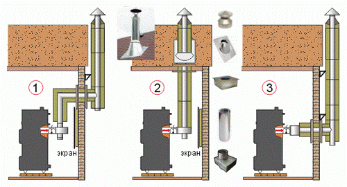 Первый вариант, когда некоторая часть трубы находится внутри, а остальная выходит через боковую стену, используется чаще всего. В этом случае внутренняя труба также играет роль в обогревании и служит в качестве батареи. К тому же, сделать вывод через стену достаточно легко.
