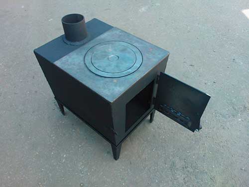 - Заключительным этапом будет установка трубы для соединения с дымоходом. Для этого, в задней части буржуйки делается отверстие, в которое и будет установлена труба. После этого детали свариваются между собой. Печь готова.