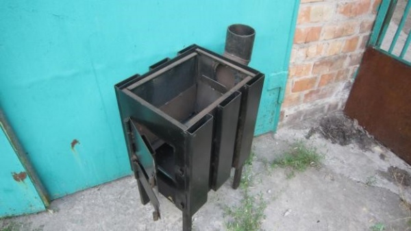 Из железных листов толщиной 3-4 мм мы предлагаем сварить дровяную печку, показанную на фото. Внешне она похожа на классическую прямоугольную буржуйку с низким КПД (до 40%), но внутри конструкция подверглась модернизации. Чтобы сделать ее экономнее, над камерой сжигания устроены два дымовых зуба, как у кирпичных каминов.