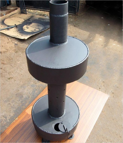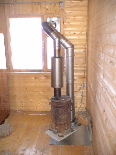 Отопительно-варочная буржуйка. Смысл в том, что за счет конструкции, на левом изгибе давление газов всегда меньше атмосферного, поэтому угарные газы не попадут из конфорки в квартиру. Если дополнительно трубу буржуйки вывести на расстояние не менее 1,5 м над коньком крыши (и оборудовать ее «грибком»), можно безопасно добавить вторую конфорку.