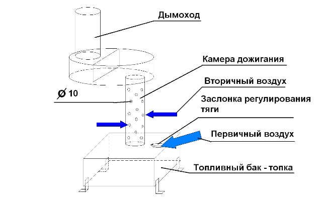 Во избежание быстрого охлаждения газов и для обеспечения их полного сгорания необходимо изменить процесс горения топлива таким образом, чтобы он проходил в режиме пиролиза. Создать же его можно с помощью высокой температуры. Причем даже если пытаться использовать в качестве топлива сухую мебель, добиться необходимого эффекта не получится.