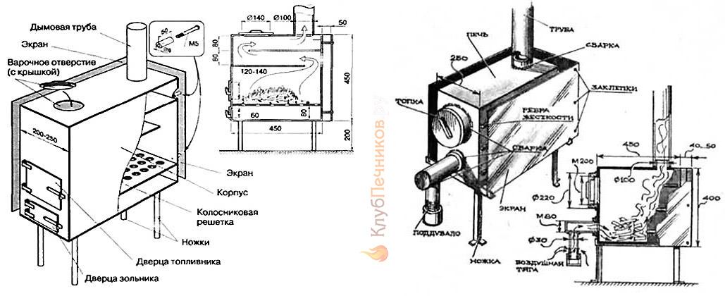 Простейшие конструкции дачных и гаражных буржуек разбирать бессмысленно – подобных чертежей в интернете хватает. Предлагаем рассмотреть более эффективные, а значит, экономичные модели с доработками, увеличивающими теплоотдачу и КПД железных печей.