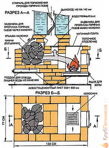 Совет. Габариты отопительного агрегата, указанные на чертеже – не аксиома, вы можете их менять на свое усмотрение. Главное, — выдержать размер (высоту) газоходов. Мы не перечисляем потребные материалы, поскольку их список очевиден – листовой металл, обрезки труб на дымоход, да металлопрокат для колосников и ножек.