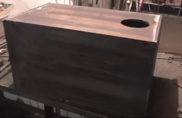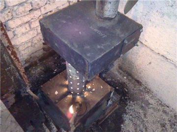- Когда все внутренние элементы печки приварены, можно заваривать верхнюю часть короба, после чего нужно сделать для дымохода отверстие.